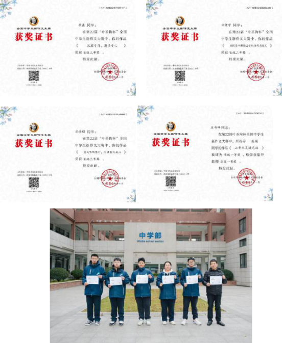 高中语文组积极组织高中生参加 2024 年下半年第 22 届叶圣陶杯全国中学生作文大赛,成绩斐然。获得省级一等奖 1 人,省级二等奖 1 人,省级三等奖 3 人。王书峰老师获辅导奖省级一等奖。