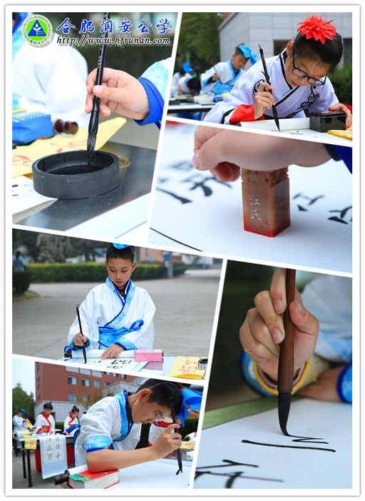 习近平总书记在十九大报告中明确提出:坚定文化自信!民族的就是世界的!汉字是华夏人民的瑰宝,书法是中华民族的国粹。为了培养学生对书法艺术的爱好,促进孩子们规范汉字的书写,推动我校特色教育活动的发展,合肥润安公学实验部五年级于2017年11月10日下午在学校成功大道举行了第一次主题为“说中国话,写中国字,做有品位的中国人!”软笔书法大赛。