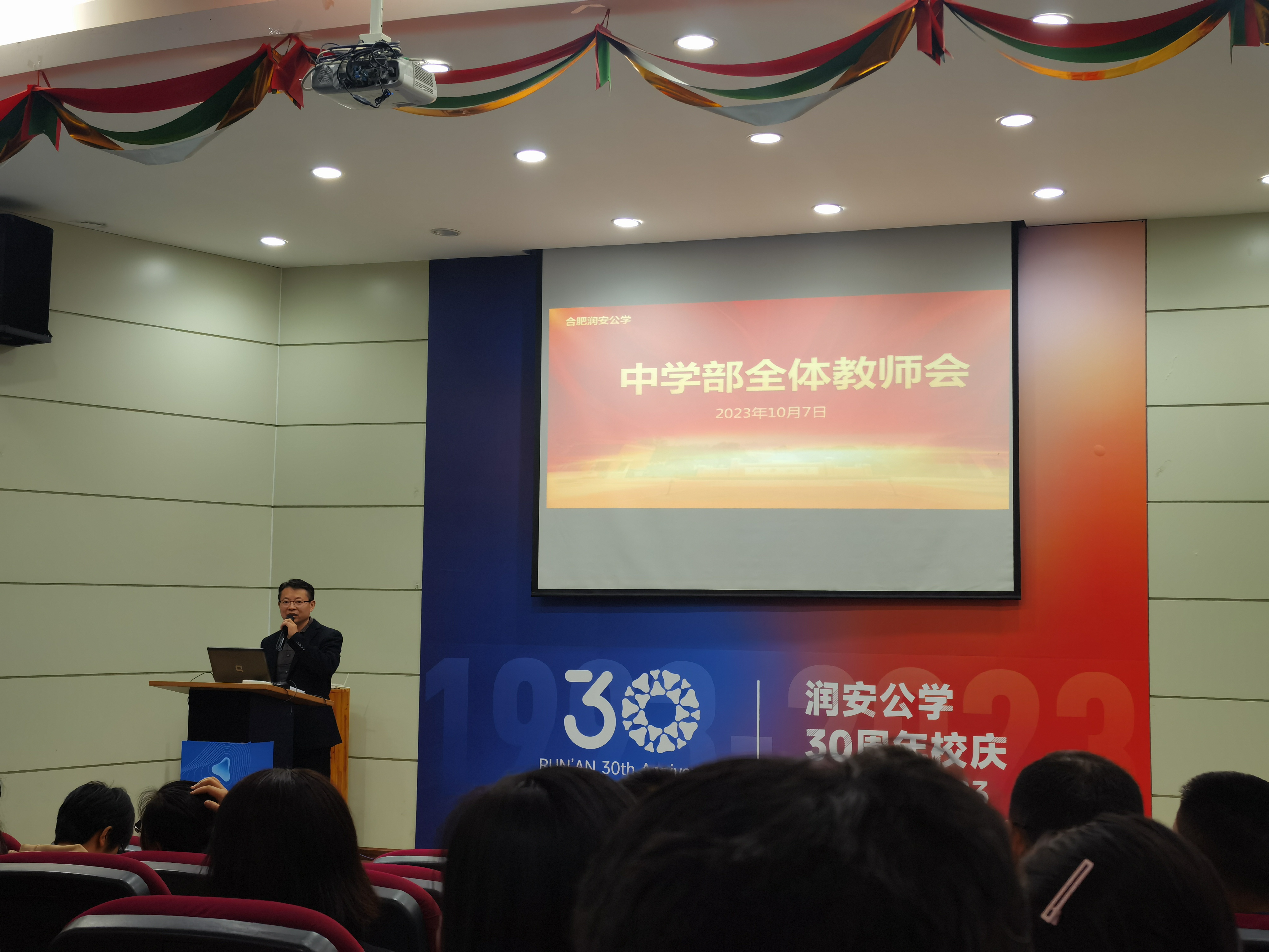 10月7日下午,合肥润安公学中学部召开2023-2024学年度第二次全体教职工大会。常务副校长杨明、德育处主任钟世好、教学处主任王书峰及全体教职员工参加大会。