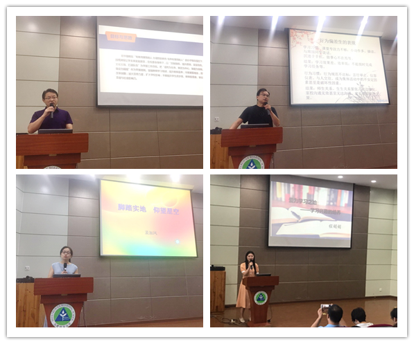 上午的培训会由学校团委钟世好书记主持。培训伊始,初中部杨明主任以《新学期学部工作构想和师德师风建设》为题,向与会教师详细地阐释了初中部新学年的工作目标和思路、德育与生活、教学和教研等九个方面。杨主任的讲座使与会教师清晰地知晓了学部未来发展的方向和工作重点。对于学部师德师风建设他提出明确的要求和殷切期望,他鼓励全体教师不忘初心,在新学期齐心协力撸起袖子加油干。随后,初中部韦东老师以《浅谈初中后进生的转化》为题,从后进生的行为表现、问题成因、解决方法三个方面详细地介绍了自己在后进生转化上的经验和做法。如何更好地做好“立德树人”工作?如何克服职业倦怠?如何提升教师教育能力?随后的培训中,针对这三个问题,裴加凤老师以《仰望星空,脚踏实地》为题,结合自己的教育教学经验,谈了自己的看法以及解决这三个问题的方法。上午培训最后,程娟娟老师就学生学习兴趣的培养分享了自己的做法。