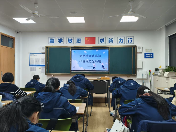 本次比赛前期,八年级物理教研组精心筹备,围绕光学核心知识点设计竞赛题目,涵盖光的直线传播、反射定律、折射规律及凸透镜成像等重点内容,既注重基础题型的规范考查,也设置了结合生活场景的创新作图题,全面检验学生对光学原理的理解与应用能力。赛前,各班级通过课堂专项训练、小组互助研讨等形式积极备战,物理教师针对作图规范、光路标注、细节处理等要点进行专项指导,为比赛顺利开展奠定了坚实基础。