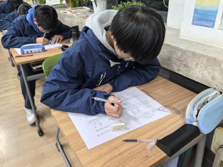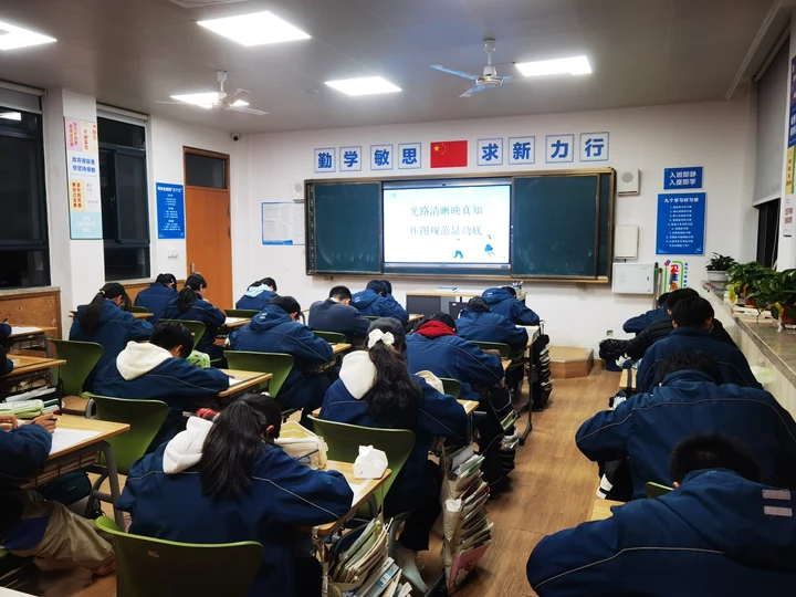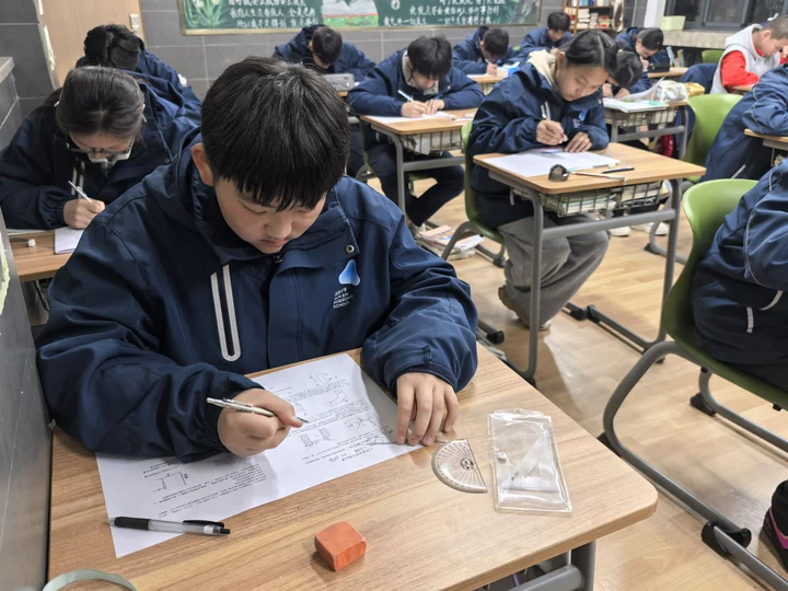 比赛当天,考场秩序井然,学子们凝神专注、沉着应战。他们手握尺规,精准绘制光线轨迹;细致审题,严谨标注入射角、反射角;巧妙构思,破解复杂光路难题。笔下的每一条光线都遵循物理规律,每一处标注都彰显规范意识,一张张整洁规范的作图答卷,不仅呈现了光学知识的逻辑之美,更展现了润安学子精益求精的学习态度。监考教师严格履职,全程保障比赛的公平公正,赛场氛围紧张而有序。