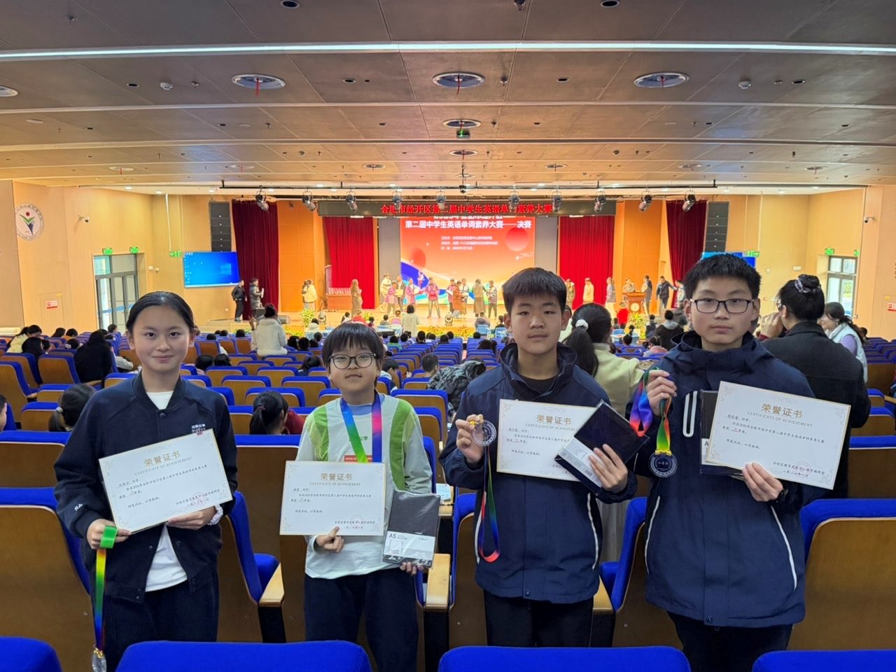 比赛现场竞争激烈,我校队员沉着应战、团结协作,先后完成看图猜词、谜语猜词、单词变形三个个人竞技环节及话题写单词团体协作环节。经过四轮激烈角逐,最终七年级代表队荣获二等奖,八年级代表队荣获一等奖。